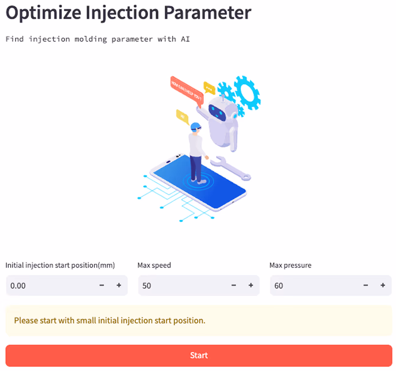 成形機とAIコントローラを連携し、計量終了位置の初期値・許容最大速度・許容最大圧力を入力して開始ボタンを押すだけです。数ショット成形すれば自動で射出速度、VP切替位置、保圧、保圧時間などの条件を算出します。